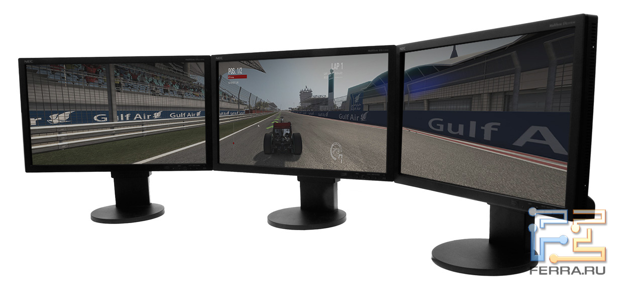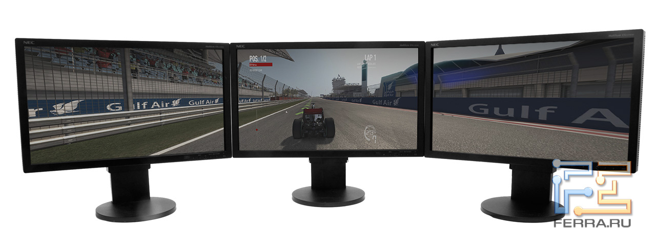 Также придется мириться с тем, что подставки мониторов займут большую часть стола. Альтернативой является настенное крепление или использование специализированных кронштейнов. Последнее является наиболее предпочтительным решением, так как позволяет идеально настроить расположение мониторов друг относительно друга. Впрочем, цена таких решений очень серьезно отодвигает нас от базовой планки в 10000 рублей. Так что аккуратно расставляем наши мониторы на столе, подстраиваем высоту и угол наклона… и думаем, куда бы нам подключить эти три монитора. Конечно, в тестовой лаборатории с этим никаких проблем нет, но покупателю Eyefinity-системы наверняка придется озаботиться приобретением нормального пилота с подобающим количеством розеток. Дальше подключаем мониторы к видеокарте, аккуратно прячем все кабели, включаем все мониторы и запускаем компьютер.